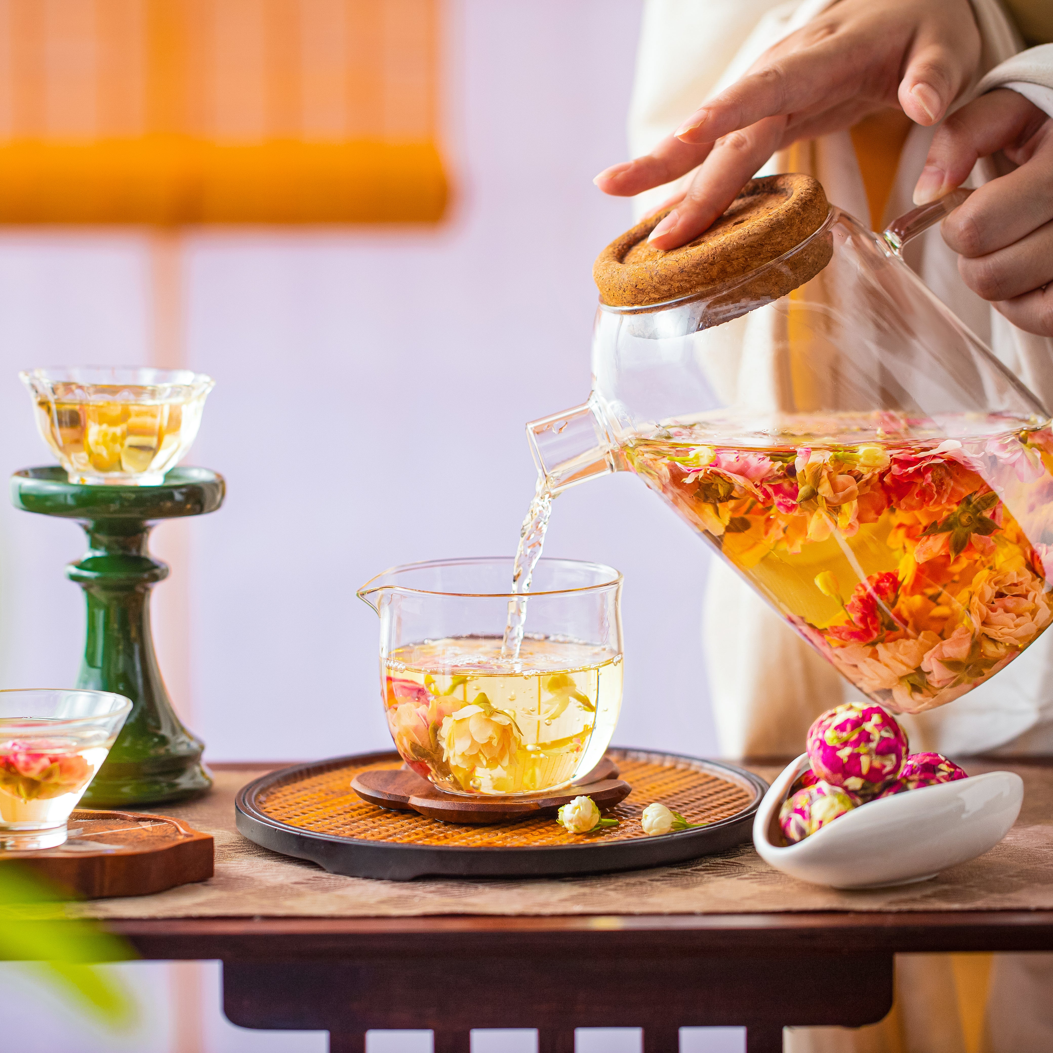 More than tea, each is a miniature floral arrangement. Carnations at the heart, chrysanthemums for balance, roses and goji for contrast — handcrafted to blossom like a bouquet in glass. Crafted not just to steep, but to perform.